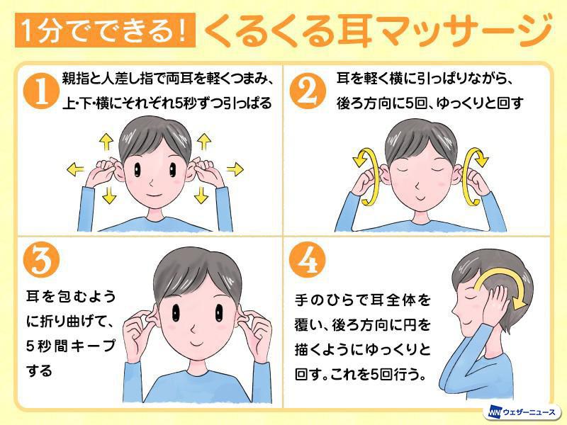 ★1分でくるくると耳マッサージ➡気圧センサーのある内耳の血行をよくすることで寒暖差疲労の不調を改善する。